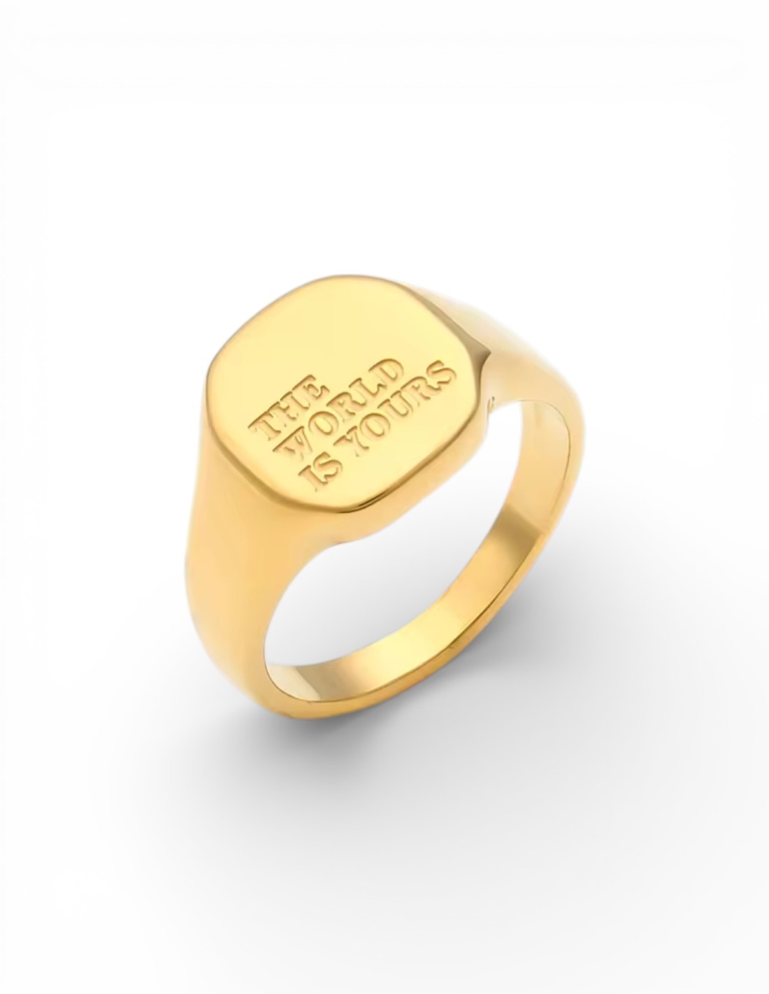 Cette bague chevalière dorée présente la gravure "THE WORLD IS YOURS" sur une plaque ovale polie. Cette phrase emblématique est aussi une référence à Tony Montana et au film Scarface évoque l’ambition, la réussite et la liberté de tracer son propre chemin.