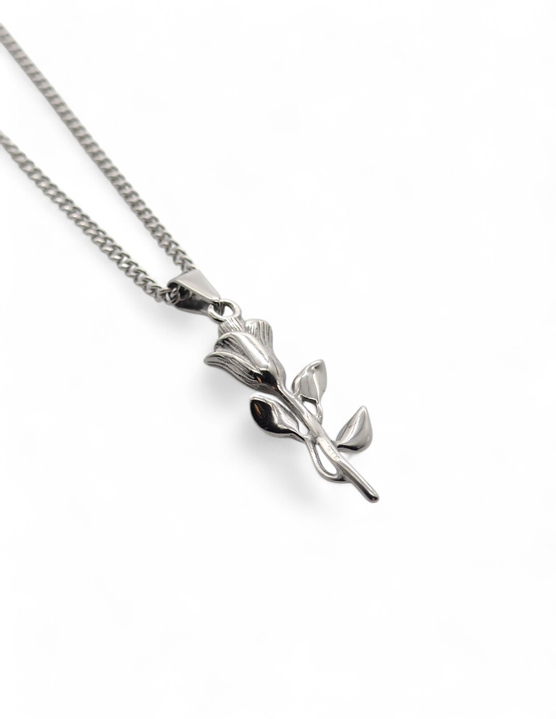 Collier avec pendentif en forme de rose argentée, une fleur emblématique qui évoque la passion et l’élégance. Les pétales finement sculptés apportent du relief et captent subtilement la lumière, créant un jeu de reflets délicat.