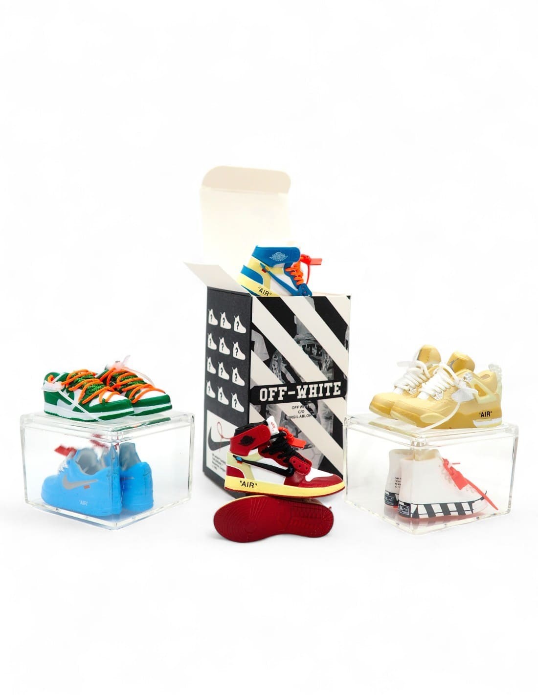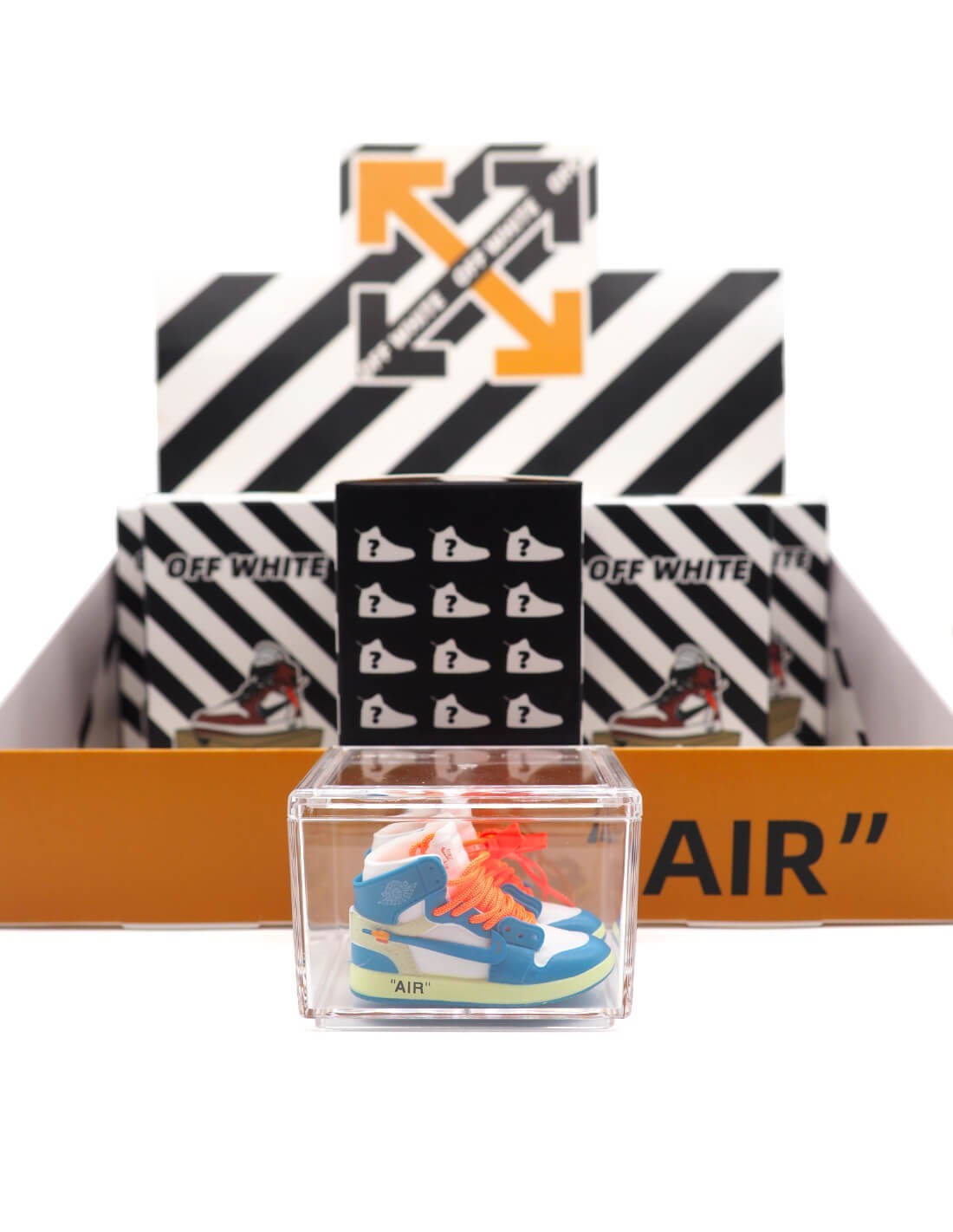 Collectionne toutes les mini sneakers de la collection Off-White dans les mystery box. Chaque boîte mystère contient une paire de basket miniatures et sa mini boite de rangement transparente.