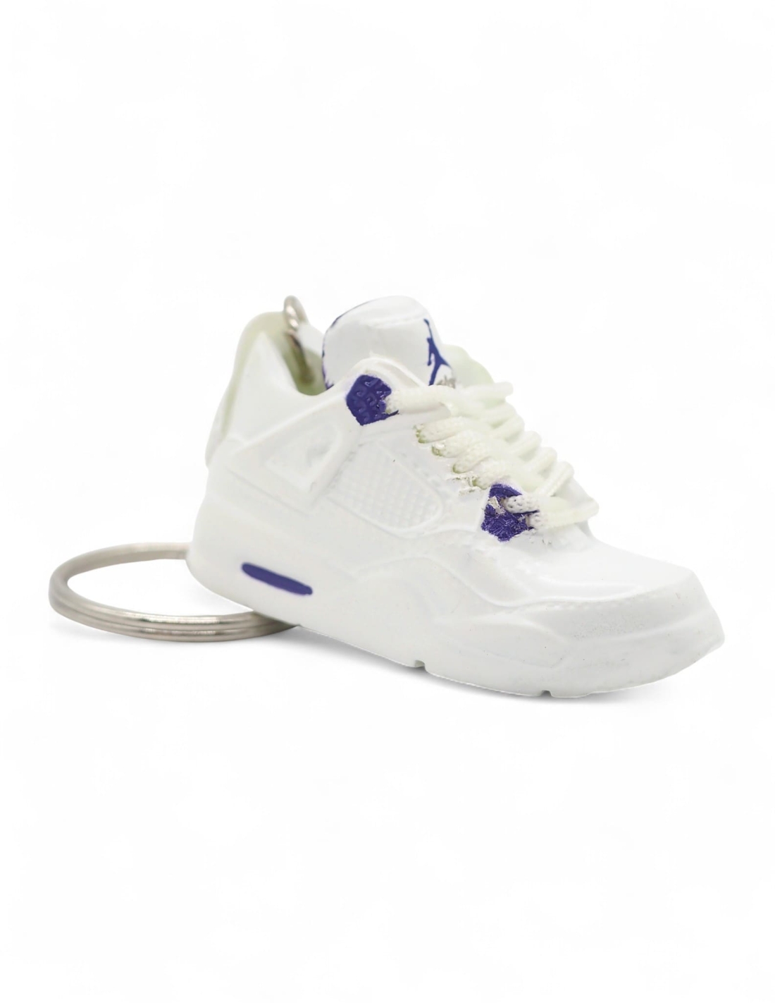 Miniature fidèle de la célèbre Air Jordan 4 Metallic, ce porte-clé reprend avec précision les détails emblématiques du modèle original. La base blanche immaculée contraste avec des touches violettes métalliques qui soulignent les œillets, le logo et la semelle.