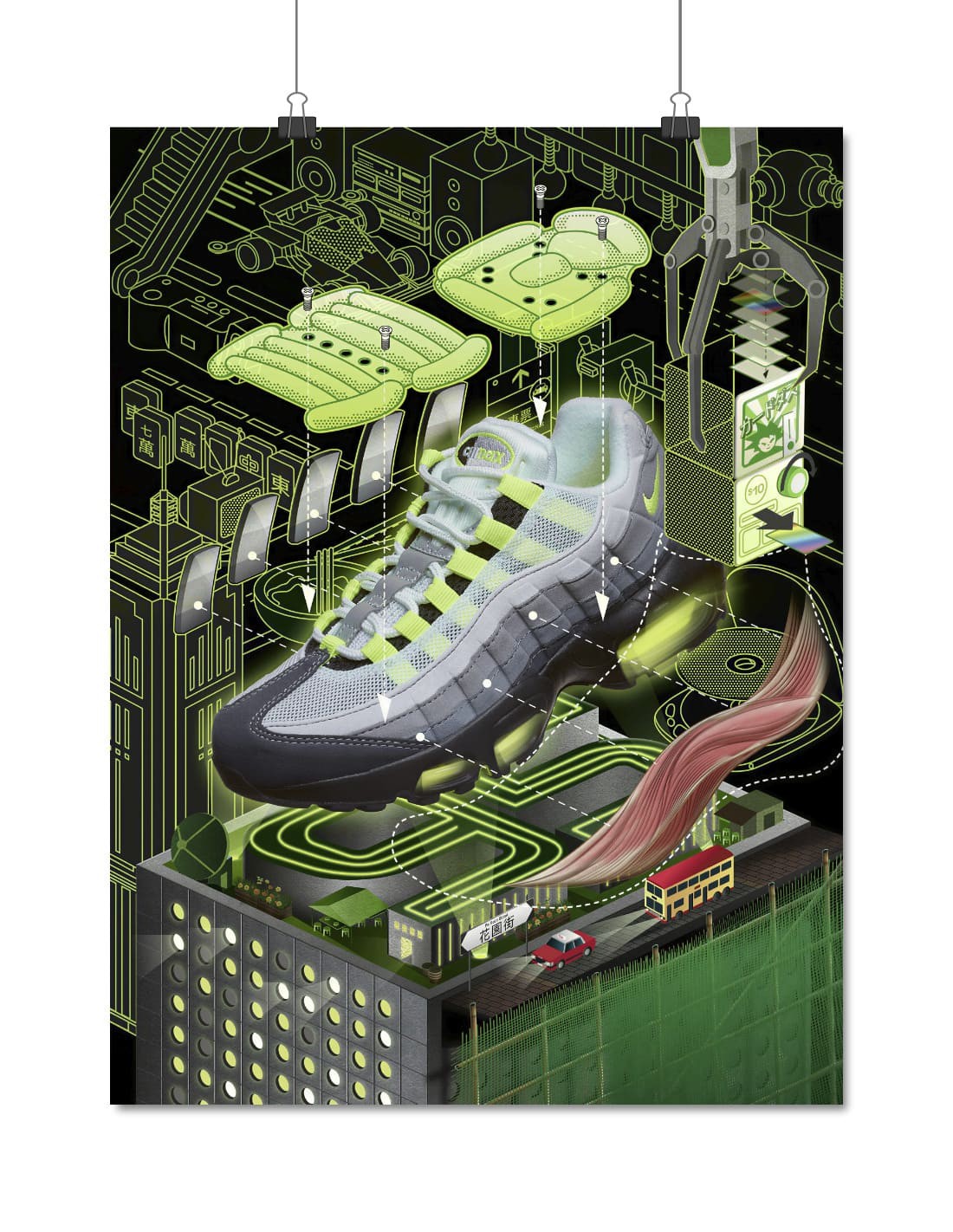 Ce poster Air Max 95 Neon met en avant une sneaker inspirée de Nike dans un univers futuriste et détaillé. Le visuel montre la chaussure au centre, entourée de schémas et d’éléments techniques qui rappellent une machine en construction.